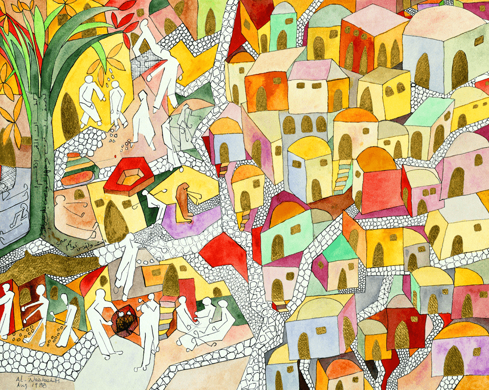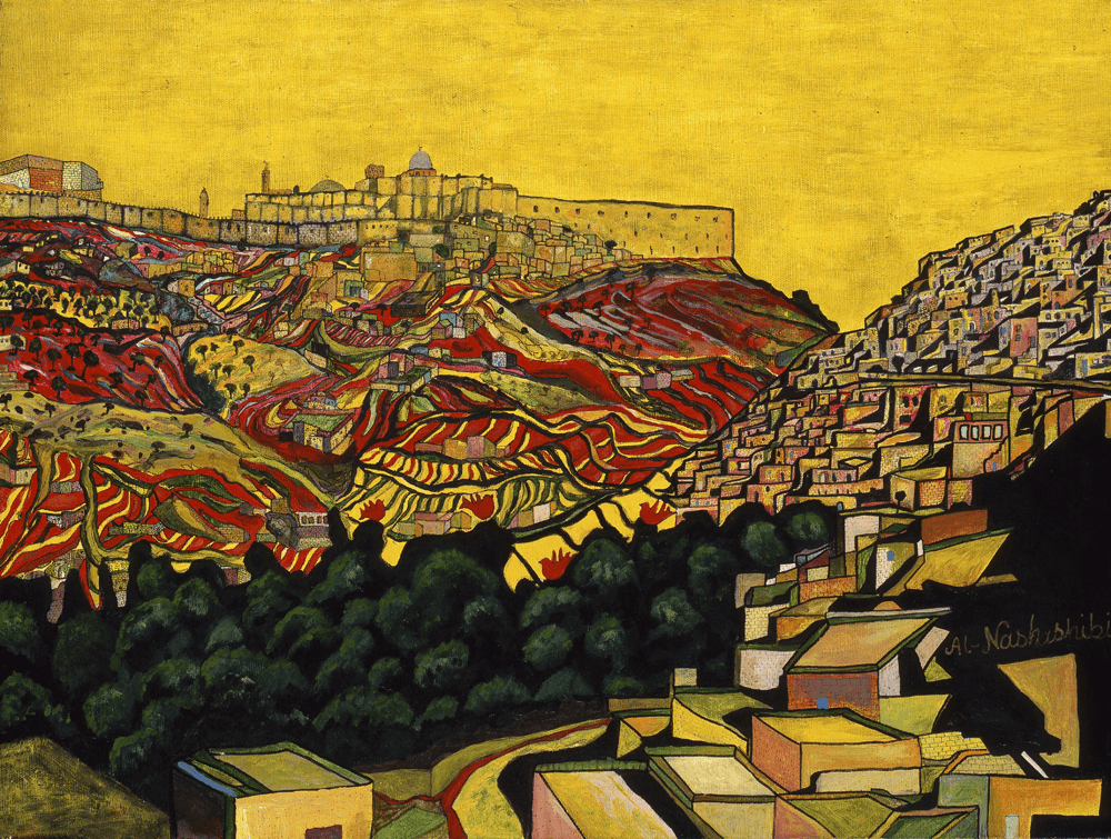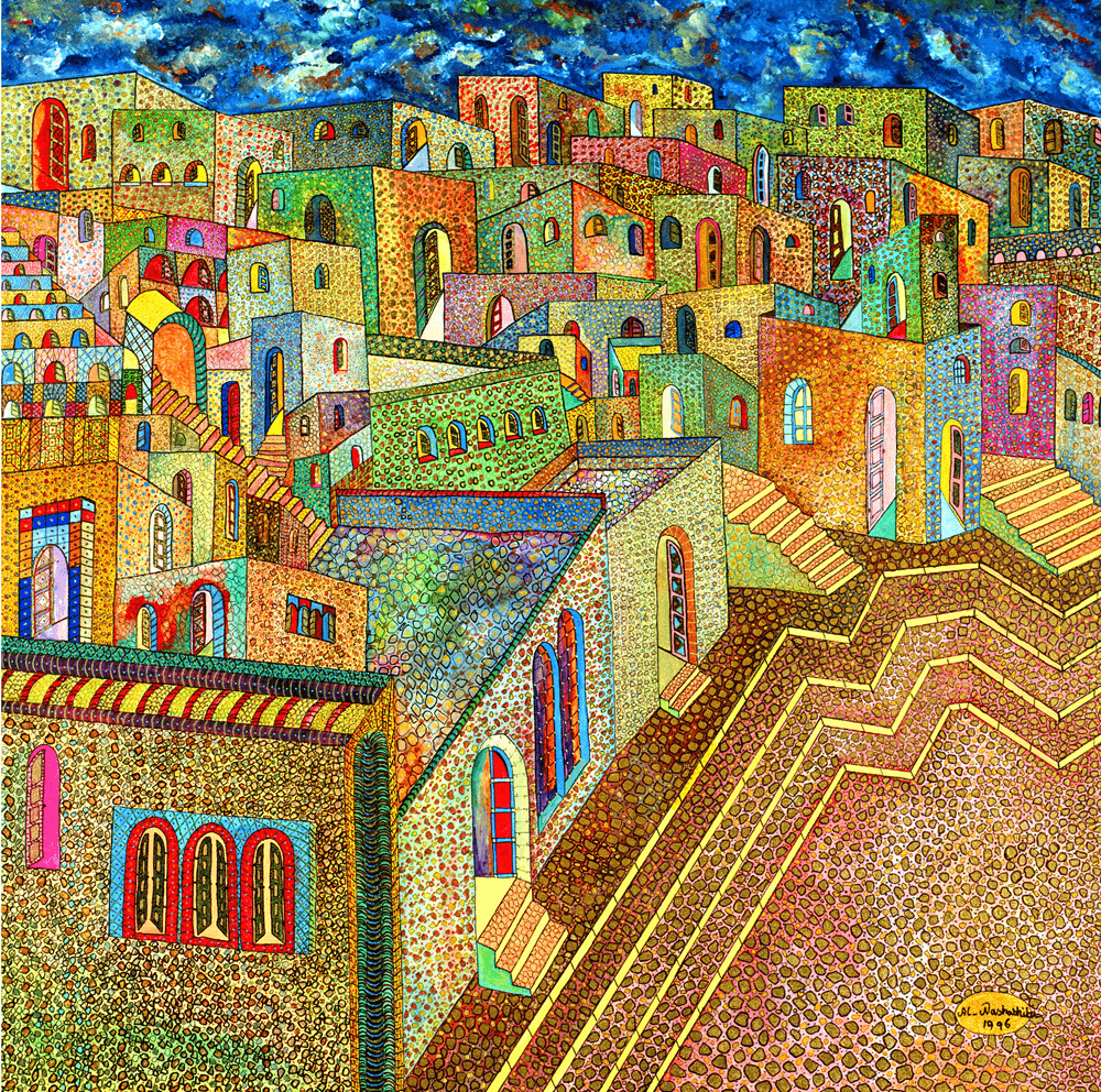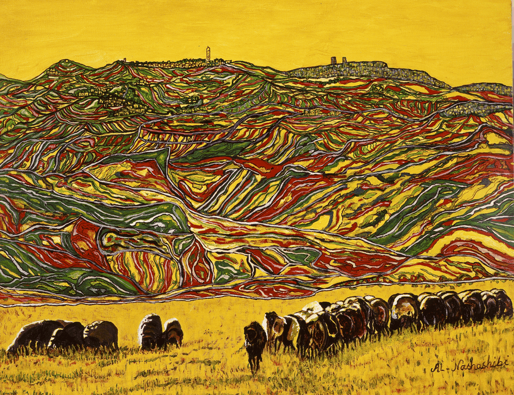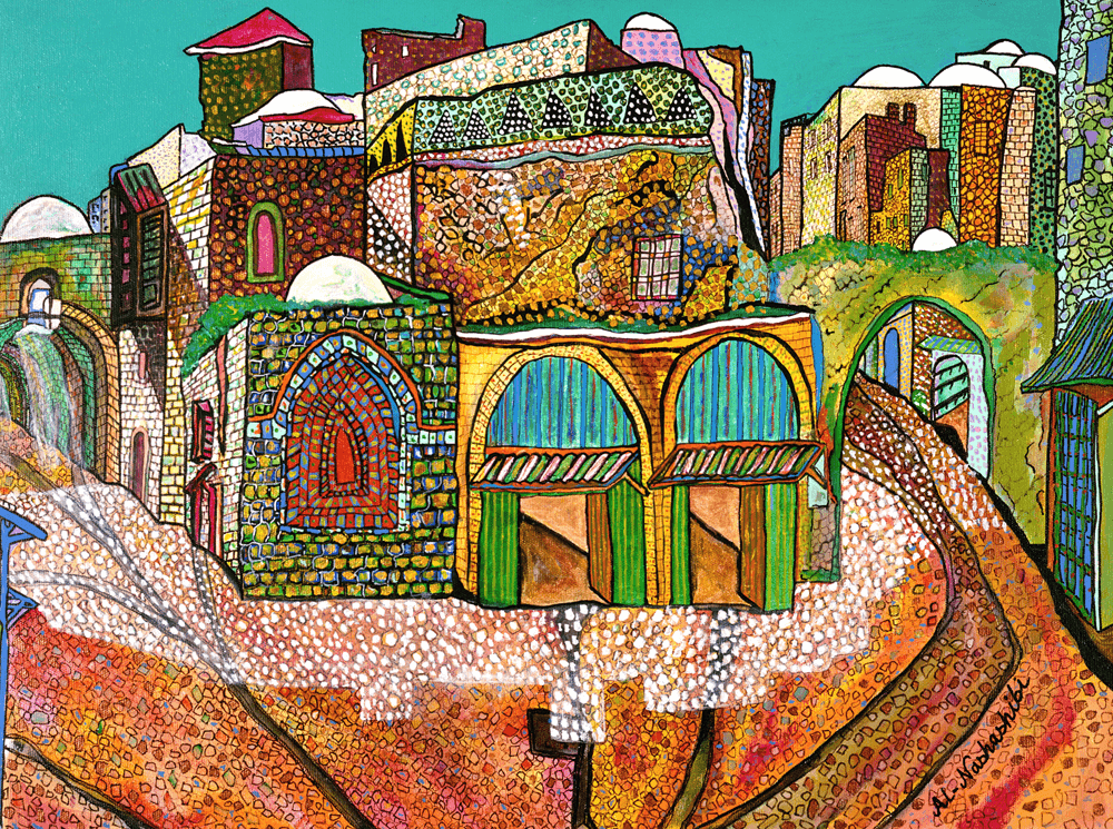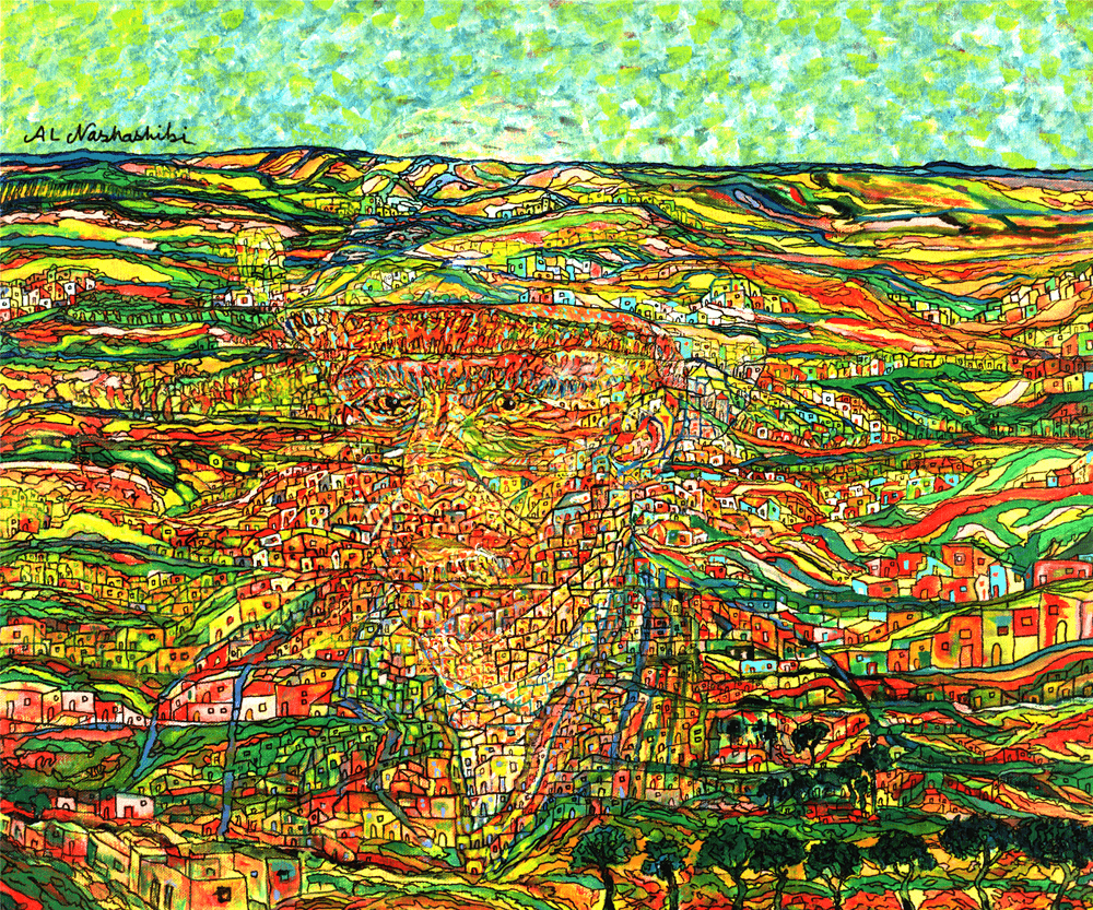 The award-winning artist, AlNashashibi, evokes a variety of emotions with abstract images and uses his creative art to convey his thoughts about key concepts in the lives of humans now and in the future. His creative use of acrylics, watercolor, ceramics, and murals expresses the images from within his soul. He uses a kaleidoscope of colors to reflect his view of people and life throughout time, and depictions of life in Jerusalem portrayed as the City of Love and as the Mother of Humanity.