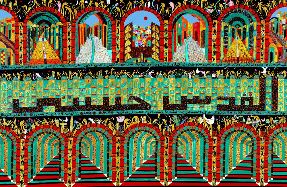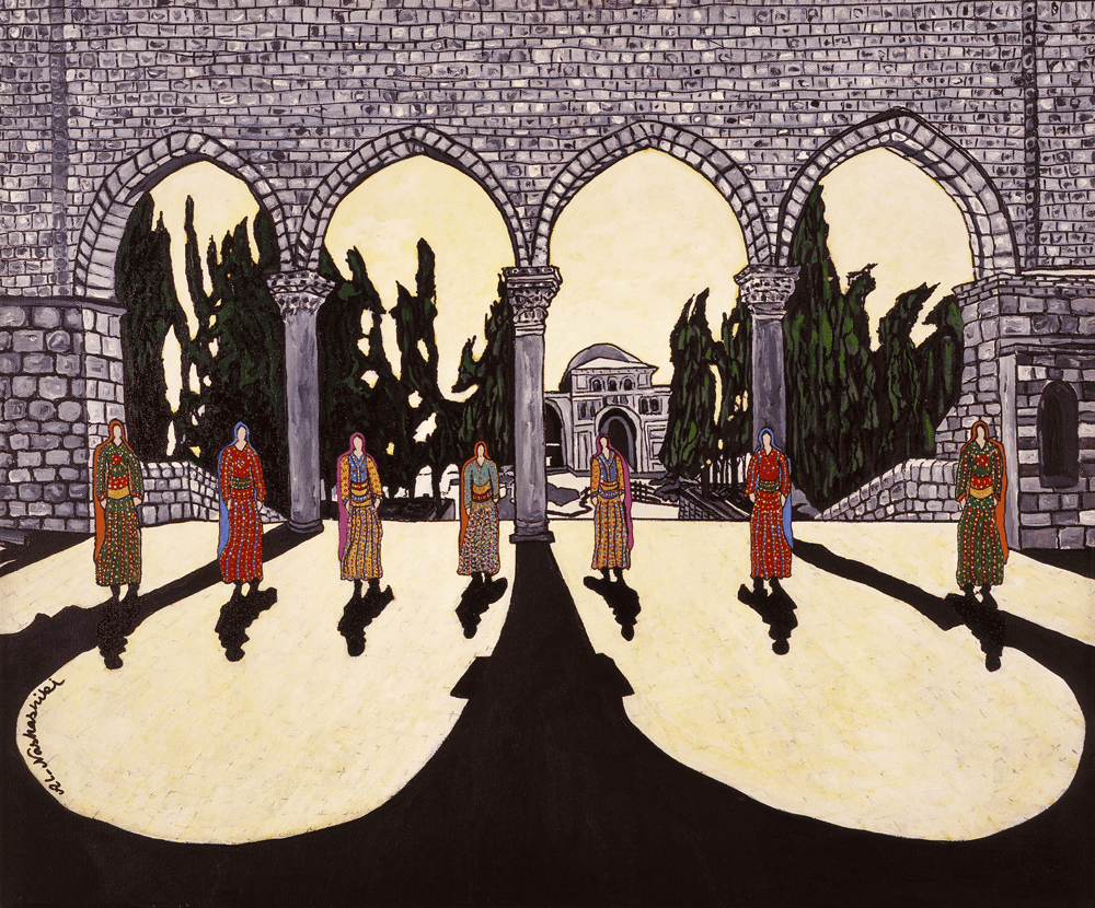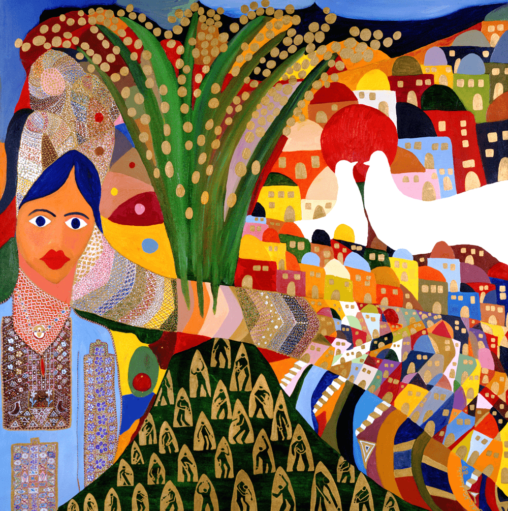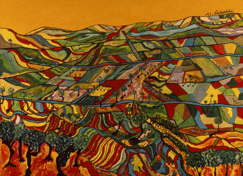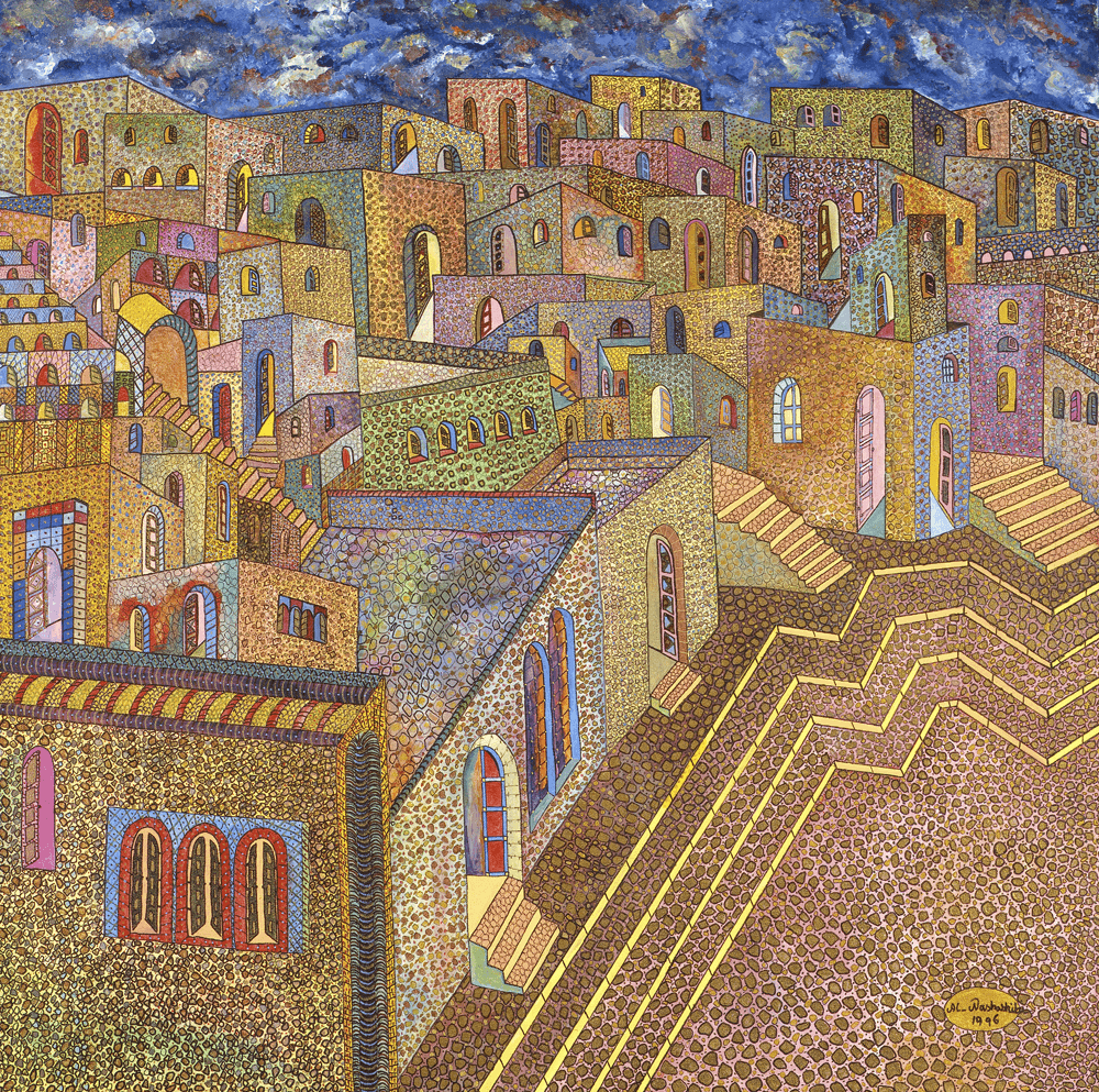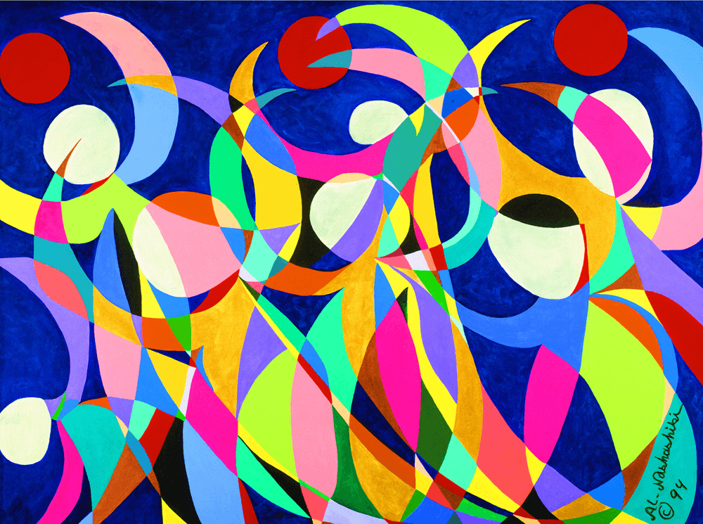 The award-winning artist, AlNashashibi, evokes a variety of emotions with abstract images and uses his creative art to convey his thoughts about key concepts in the lives of humans now and in the future. His creative use of acrylics, watercolor, ceramics, and murals expresses the images from within his soul. He uses a kaleidoscope of colors to reflect his view of people and life throughout time, and depictions of life in Jerusalem portrayed as the City of Love and as the Mother of Humanity.